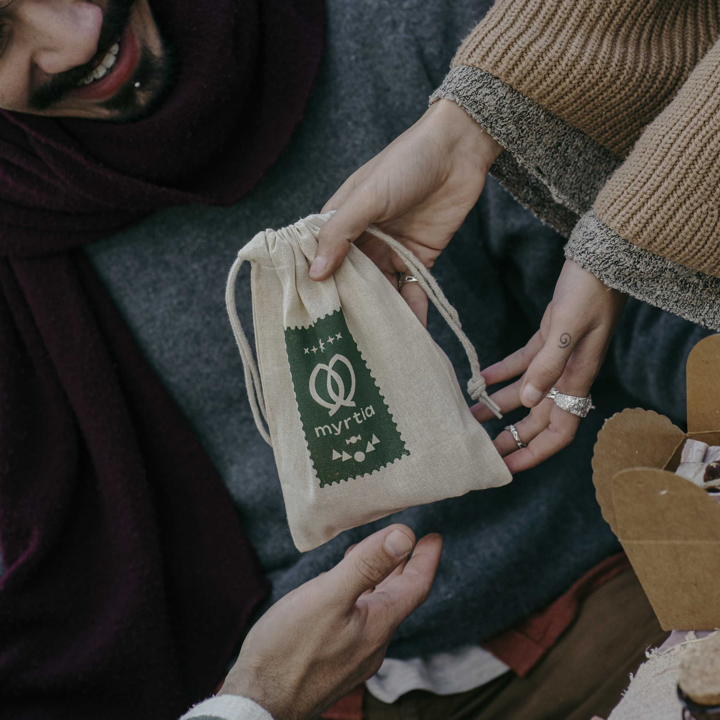 Ένα πουγκάκι από οργανικό βαμβάκι, τυπωμένο στο χέρι με μεταξοτυπία, κρύβει μέσα του 5 μικρά χριστουγεννιάτικα σαπουνάκια σε μαγευτικά σχήματα και γιορτινά αρώματα.