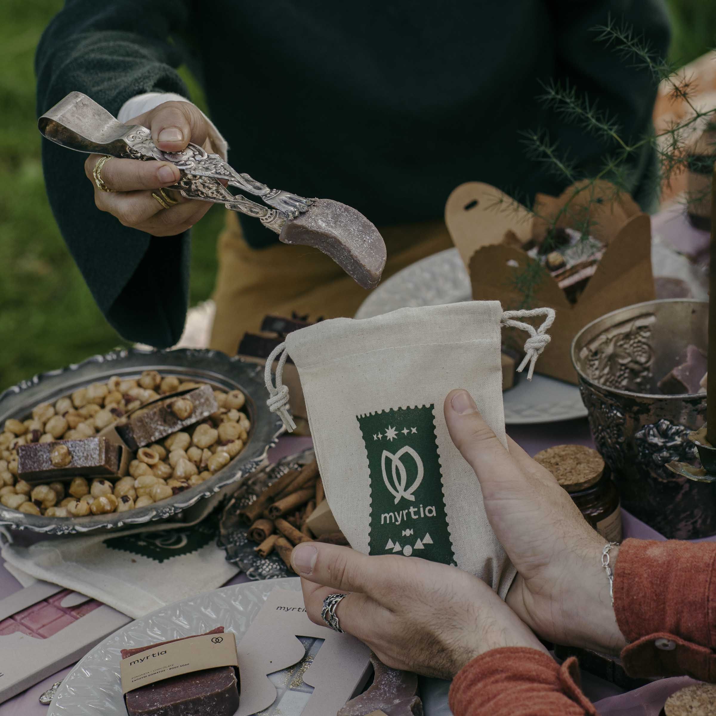 A pouch made of organic cotton, hand-printed with silkscreen, hides inside 5 small Christmas soaps in enchanting shapes and festive scents.